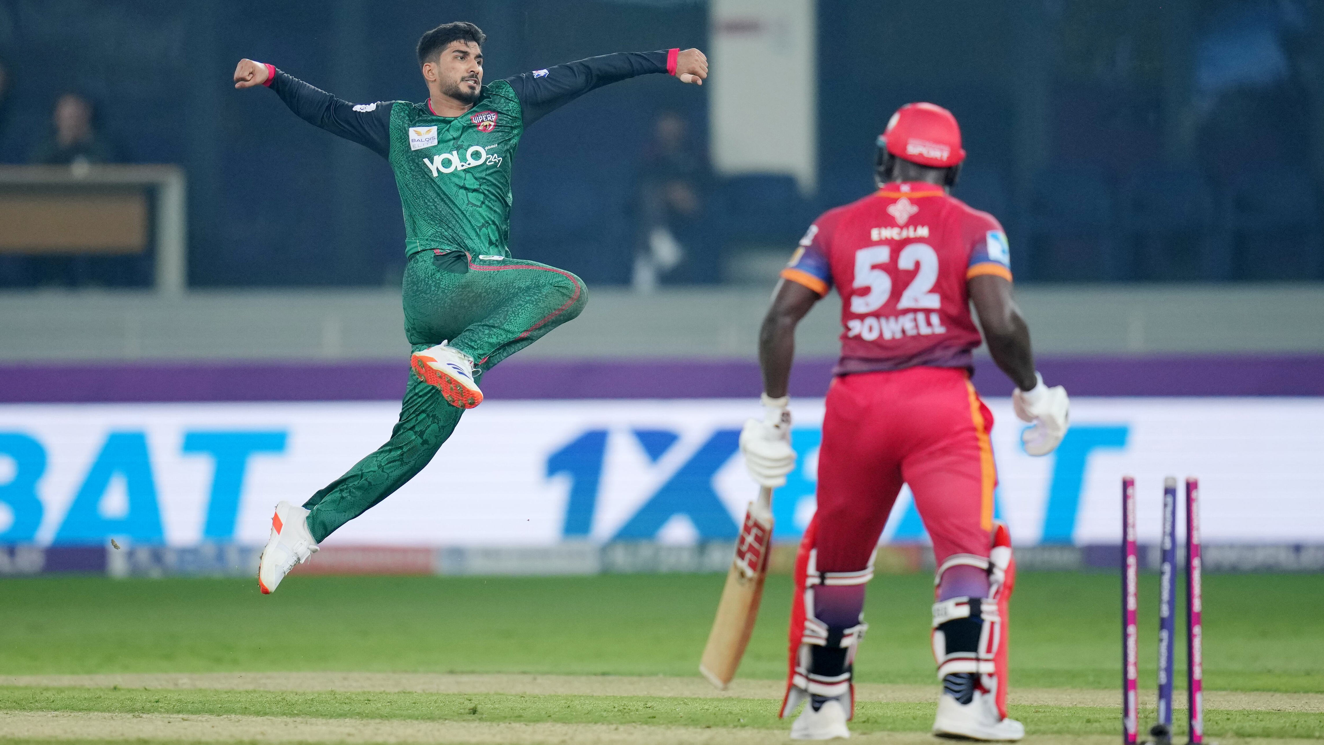 The other UAE pick in the Vipers side, fast bowler Khuzaima Tanveer, impressed again. First, he dismissed Shayan Jahangir. Later, he struck back pluckily having suffered at the hands of Rovman Powell.
